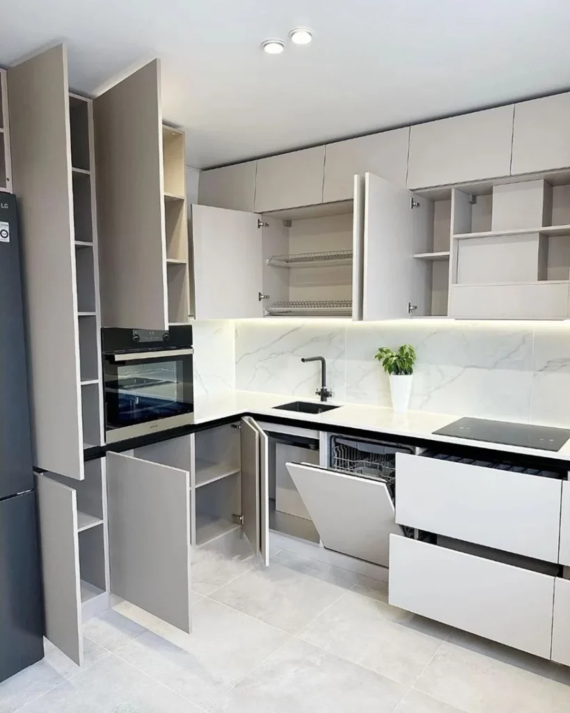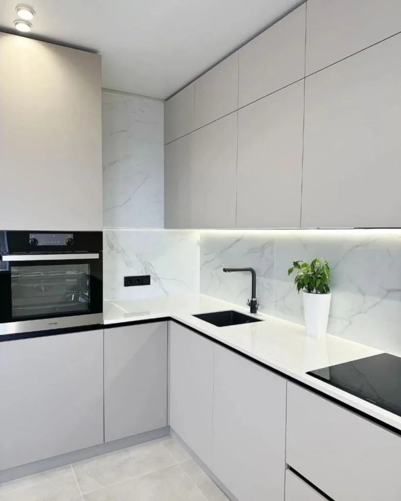 Kuchnia nowoczesna narożna dla studia z szarymi matowymi frontami 023